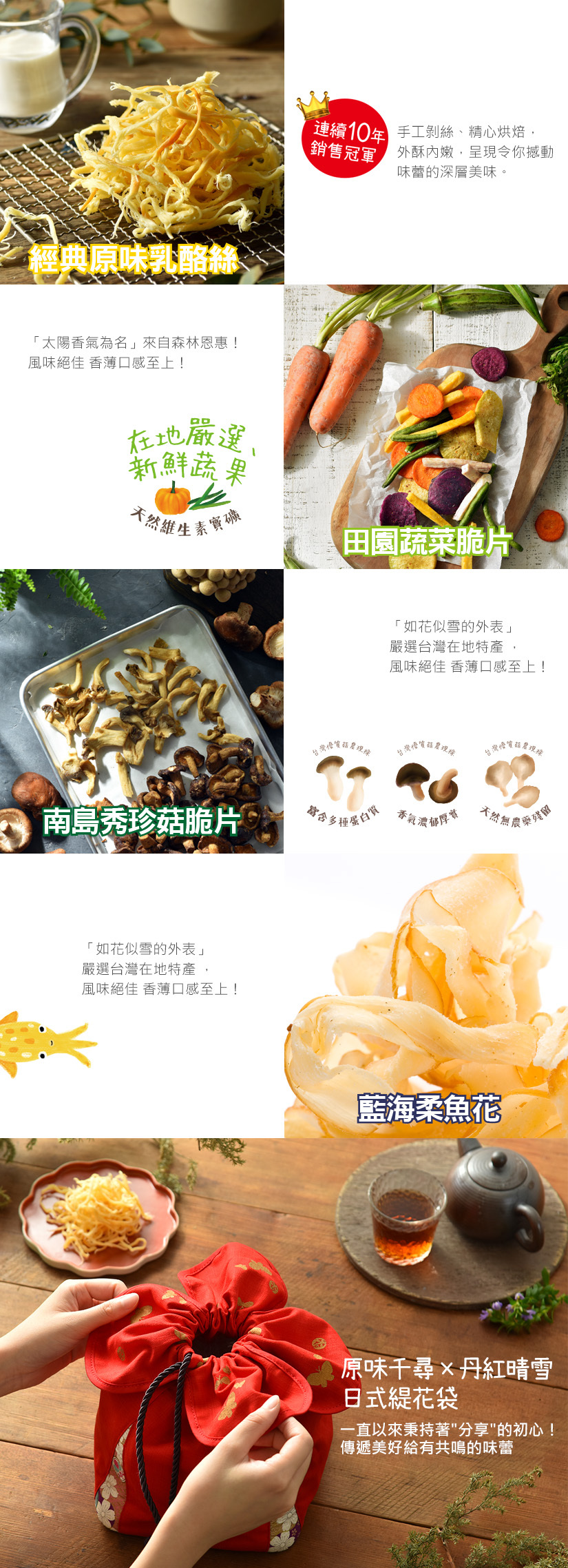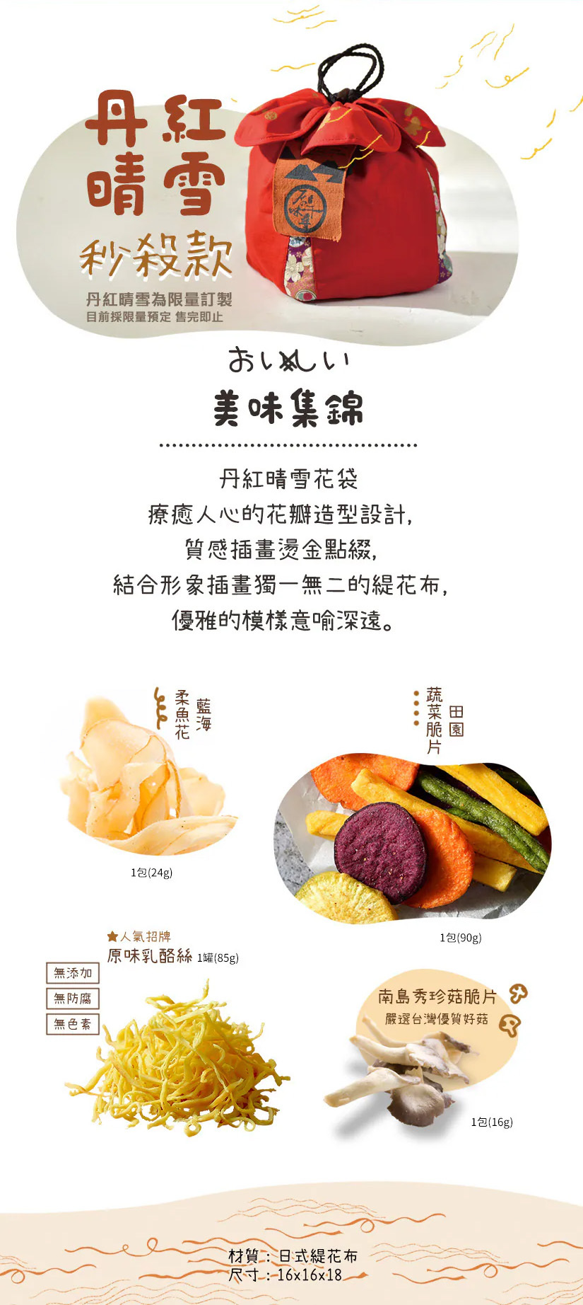 內 容 物|溫熱揉捏按摩枕+原味乳酪絲(白雪罐裝)85g、田園蔬菜脆片80g、南島秀珍菇脆片16g、烏秋大捲片16g 、曼波肉絲32g (禮盒內容物遇缺貨,同等值商品替代)