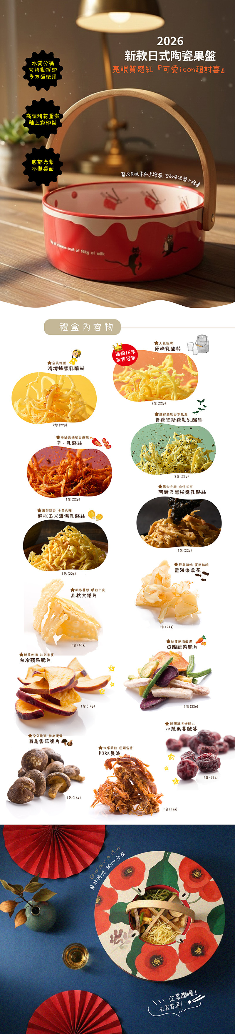 內  容  物|經典9口味乳酪絲 (原味乳酪絲22g*2入、蜂蜜乳酪絲22g*2入羅勒乳酪絲22g*2入、辛.乳酪絲22g*1入、玉米濃湯乳酪絲22g*1入松露乳酪絲22g*1入)、藍海柔魚花24g、烏秋大捲片16g、田園蔬菜脆片22g、白冷蘋果脆片14g、南島香菇脆片16g、PORK曼波32g、小漿果蔓越莓32g   (禮盒內容物遇缺貨,同等商品替代)
