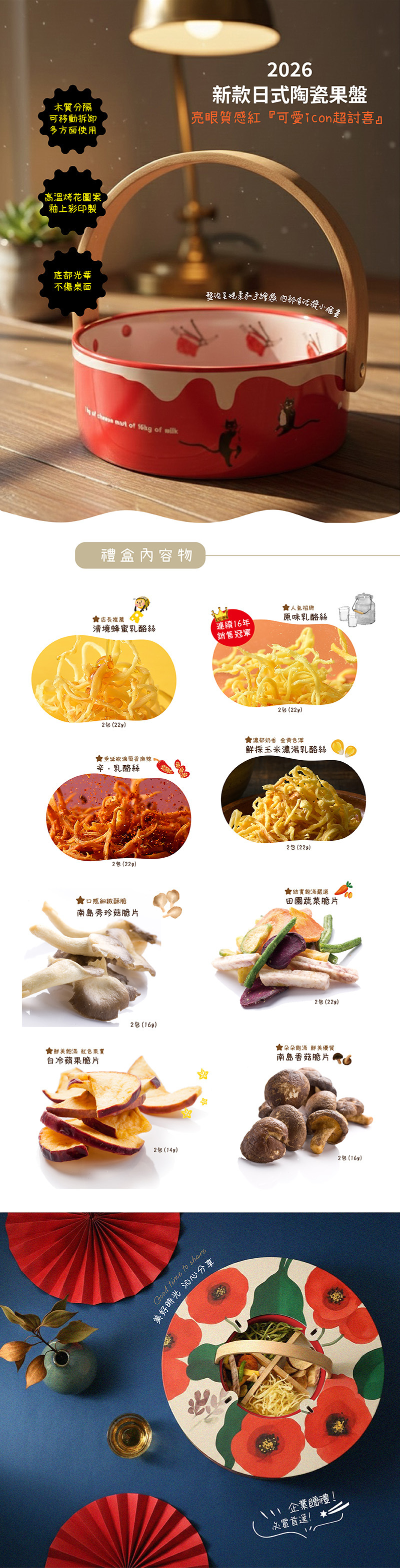 內 容 物|原味乳酪絲(奶素)22g*2入、蜂蜜乳酪絲(奶素)22g*2入、辛.乳酪絲(奶素)22g*2入、玉米濃湯乳酪絲(奶素)22g*2入、田園蔬菜脆片22g*2入、白冷蘋果脆片14g*2入、南島香菇脆片16g*2入、南島秀珍菇16g*2入 (禮盒內容物遇缺貨,同等值商品替代)