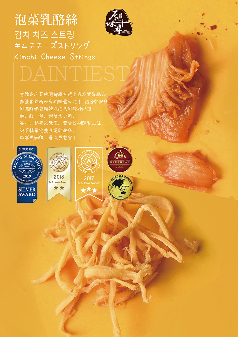 當韓式泡菜的濃郁風味遇上高品質乳酪絲,激盪出前所未有的味覺火花! 結合乳酪絲的濃醇奶香與韓式泡菜的酸辣勁道鹹、酸、辣、甜層次分明,每一口都帶來驚喜。黃金比例醃製工法,泡菜精華完整滲透乳酪絲,口感更細緻、層次更豐富!